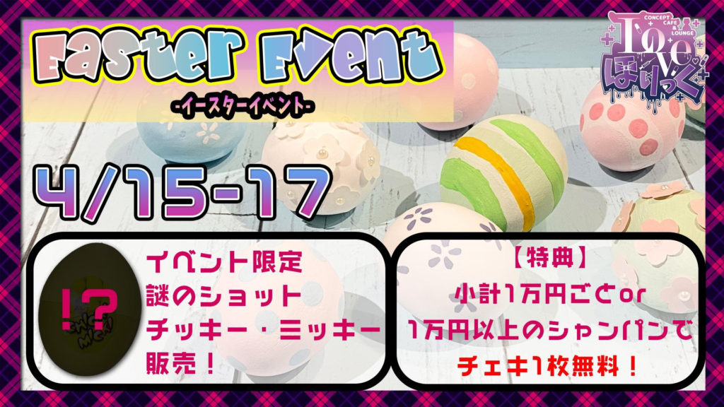 2022年4月9日 / 最終更新日 : 2022年4月9日 a-admin 未分類 イースターイベント開催します!限定ショットもあるよ~ 4/15-17イースターイベントにあわせて、イベントを開催します。卵型のお酒チッキーミッキーも販売決定したのでお試しあれ!! コメントを残す コメントをキャンセルメールアドレスが公開されることはありません。 ※ が付いている欄は必須項目ですコメント ※ 名前 ※ メール ※ サイト 次回のコメントで使用するためブラウザーに自分の名前、メールアドレス、サイトを保存する。